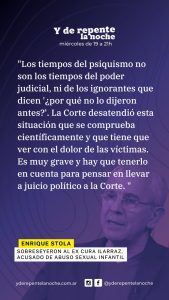 En esta entrevista, Enrique Stola, médico psiquiatra con extensa experiencia en asistencia a víctimas en procesos judiciales, analiza el caso y sostiene: «Los tiempos del psiquismo no son los tiempos del poder judicial, ni de los ignorantes que dicen ‘¿por qué no lo dijeron antes?’. La Corte desatendió esta situación que se comprueba científicamente u que tiene que ver con el dolor de las víctimas. Es muy grave y hay que tenerlo en cuenta para pensar en llevar a juicio político a la Corte».